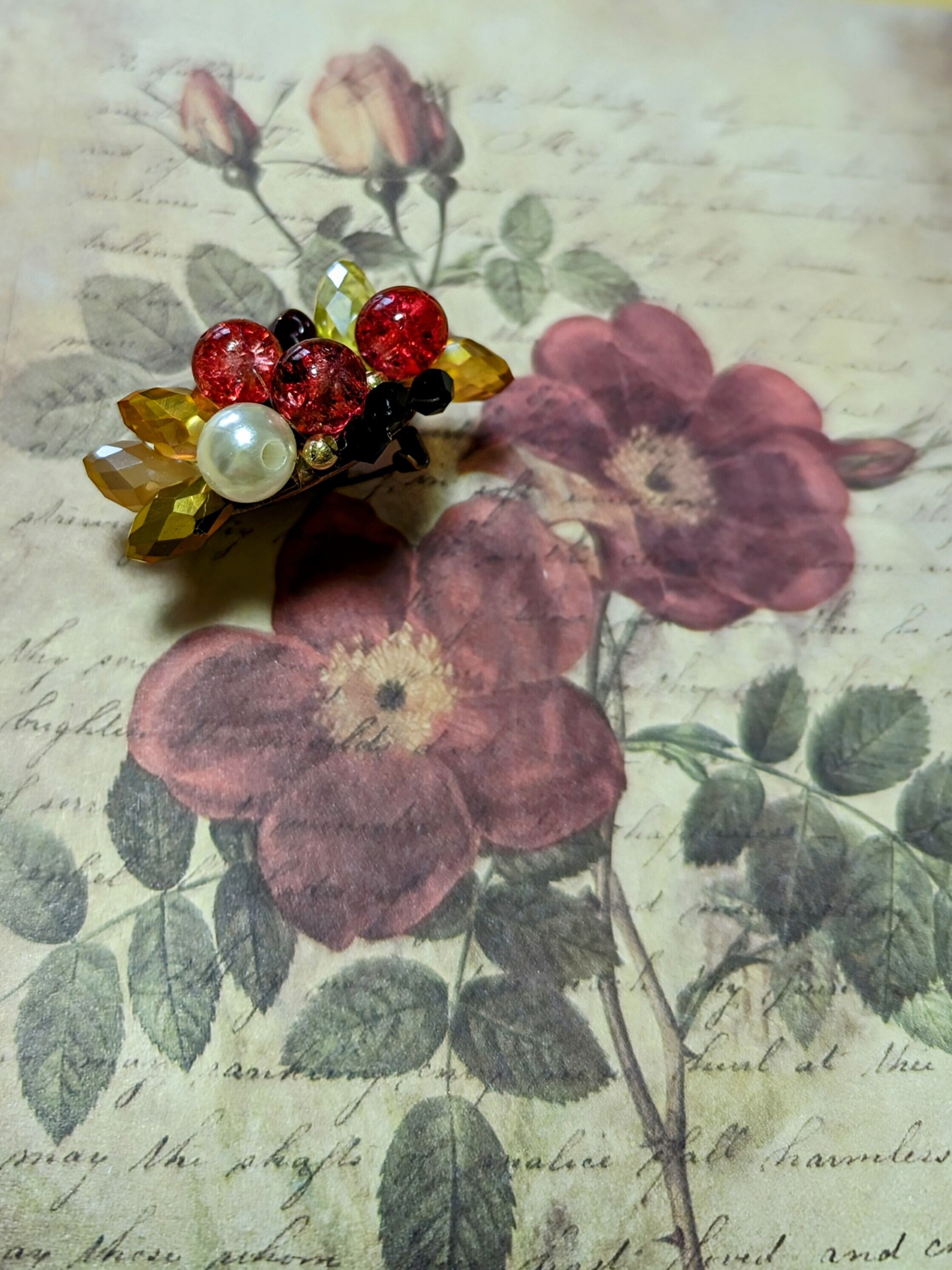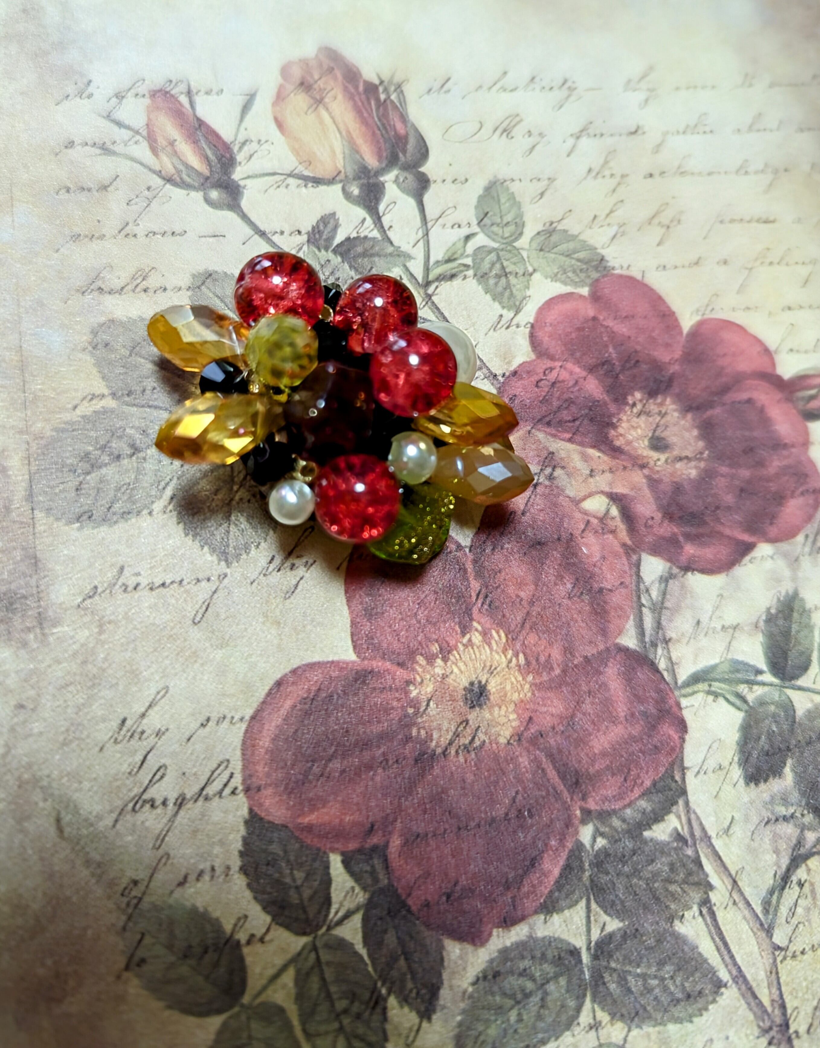 アンティークライクなブローチパーツに大粒のガラスやパールビ一ズをふんだんにあしらった