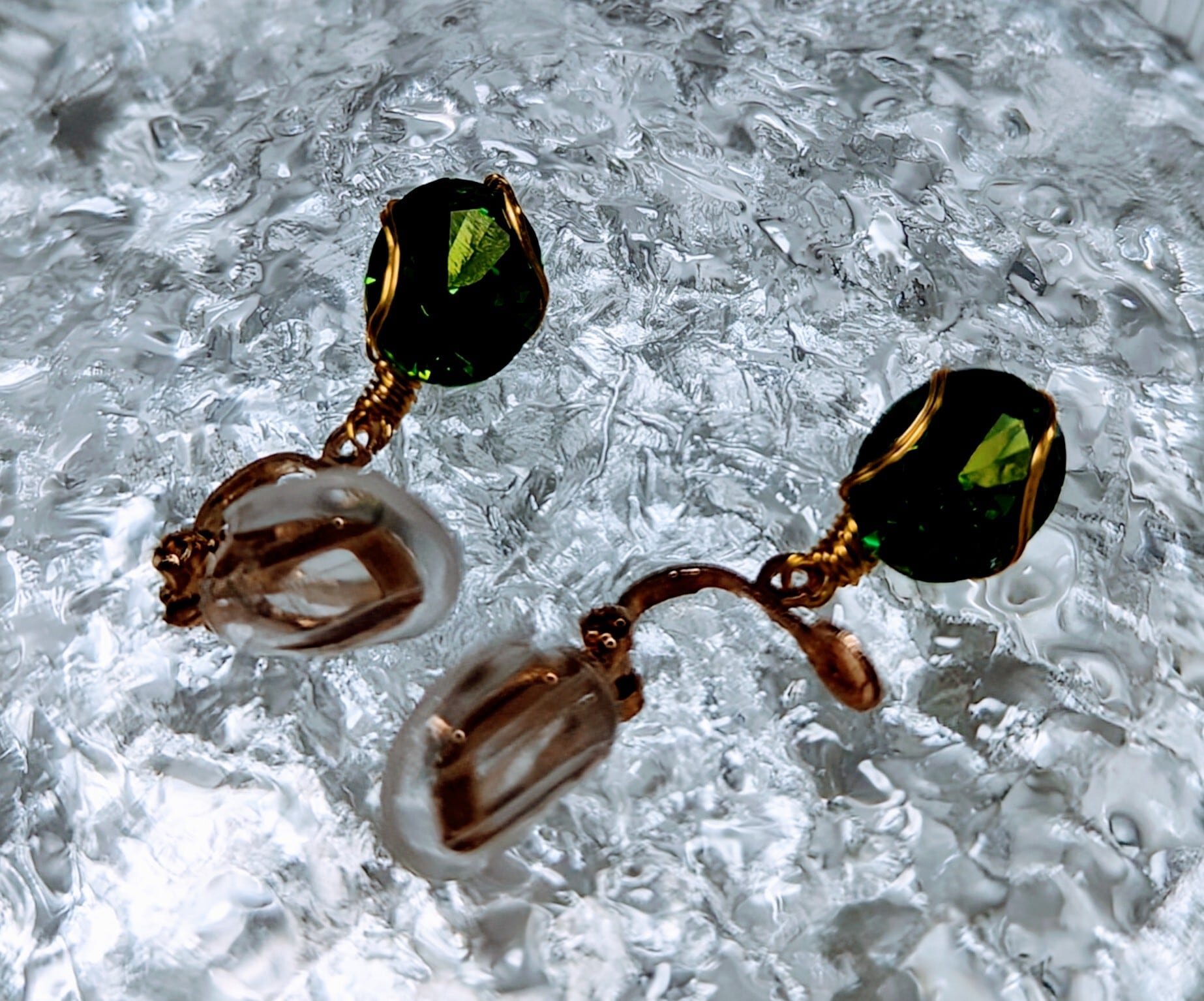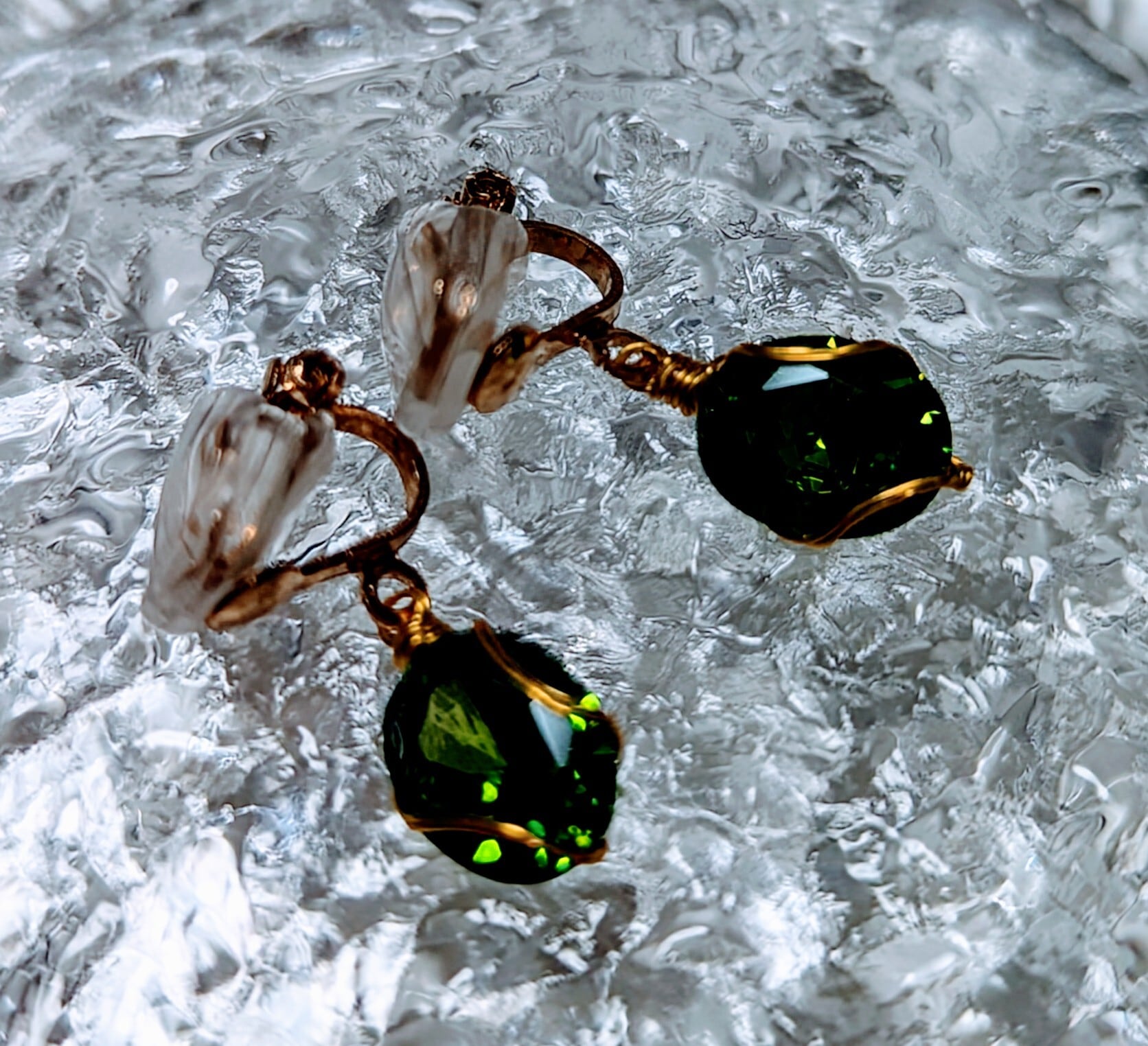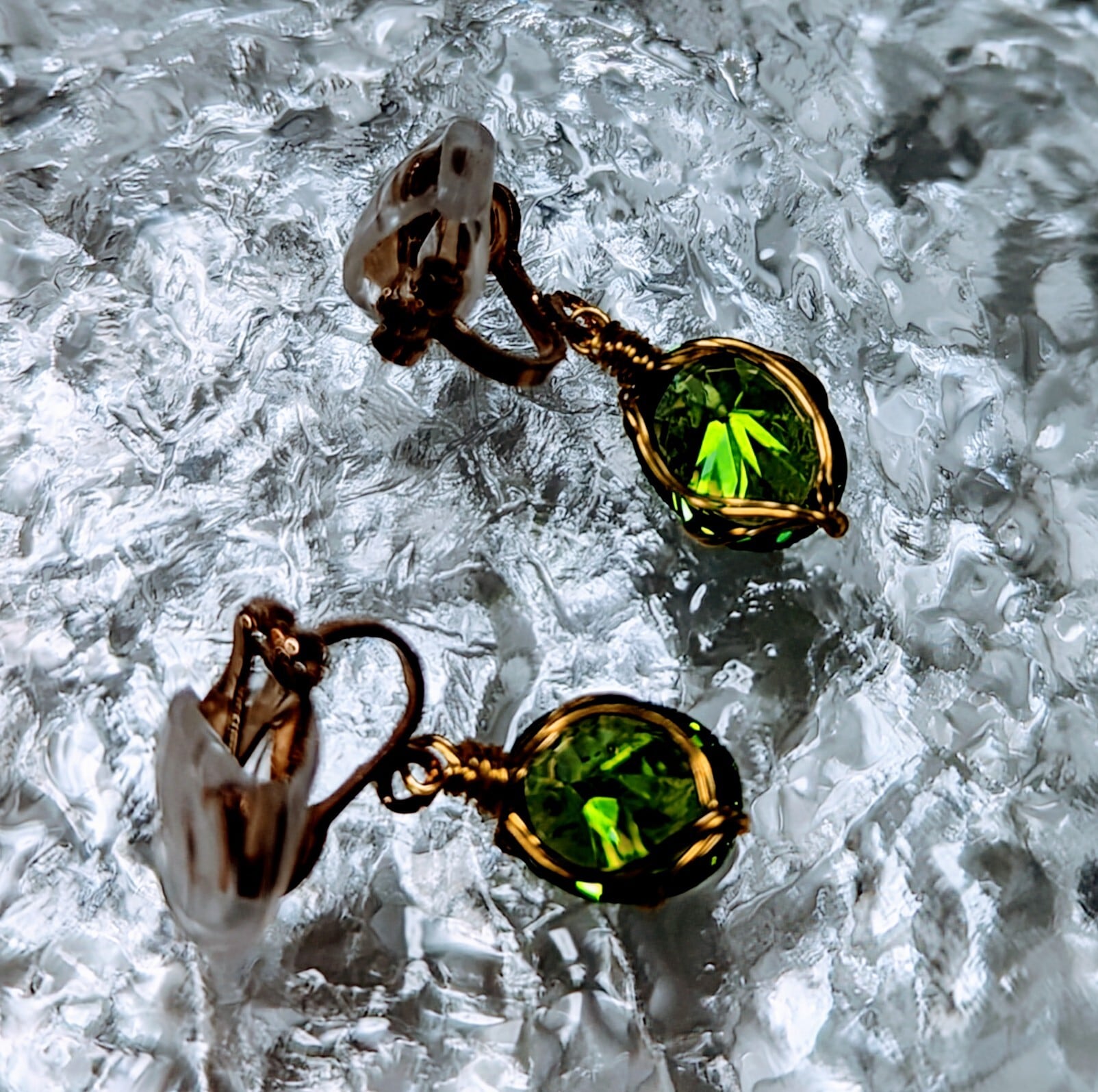 Leaf dew earrings (葉露のイヤリング)は、太陽の光に輝くエメラルドグリーン色の美しい葉露をモチーフにしたシックでエレガントなイヤリングです。