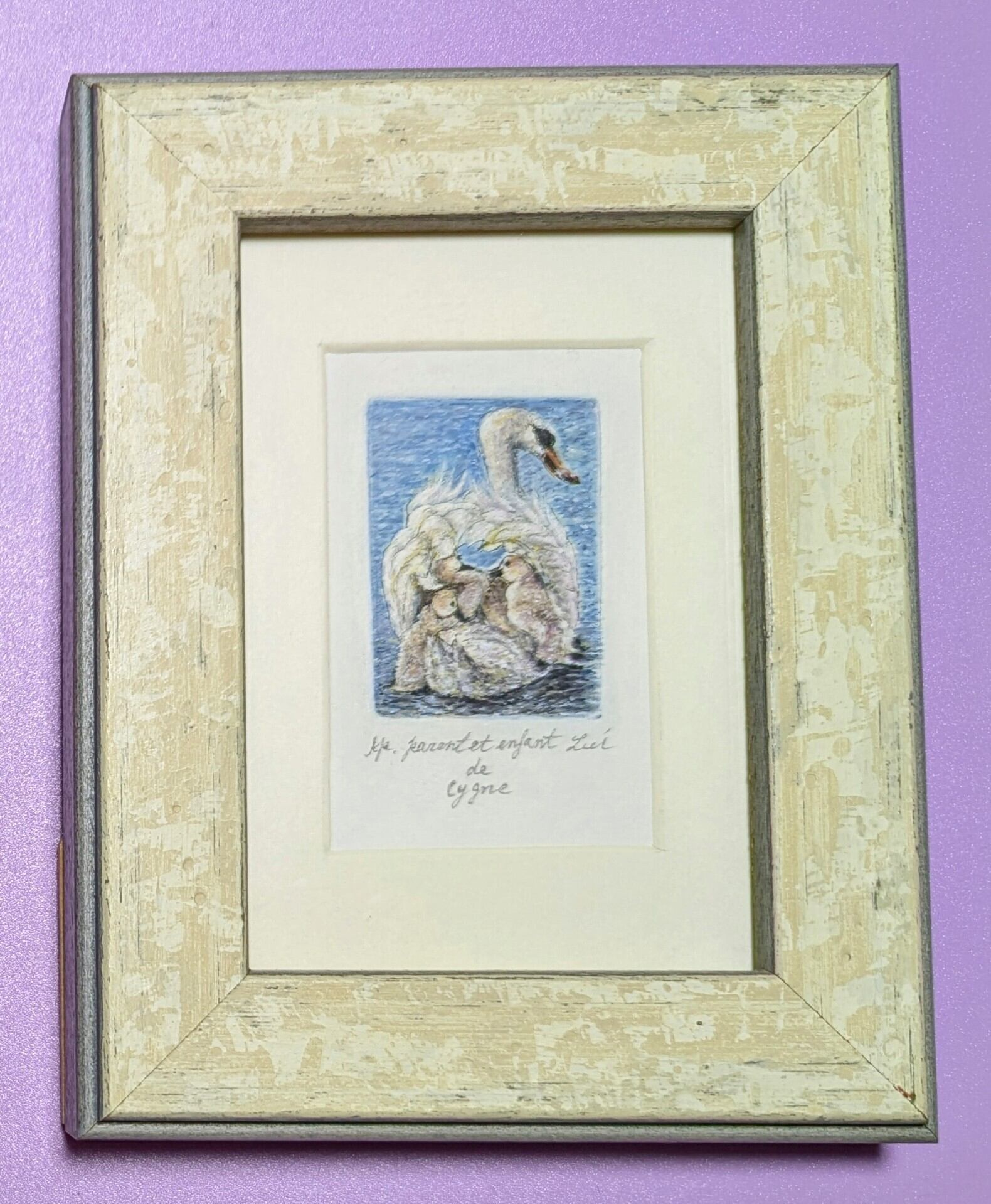 この作品は、優雅な白鳥とその愛らしい雛が寄り添う姿を、縦5cm✕横3.4cmの画面に繊細に描写しています。